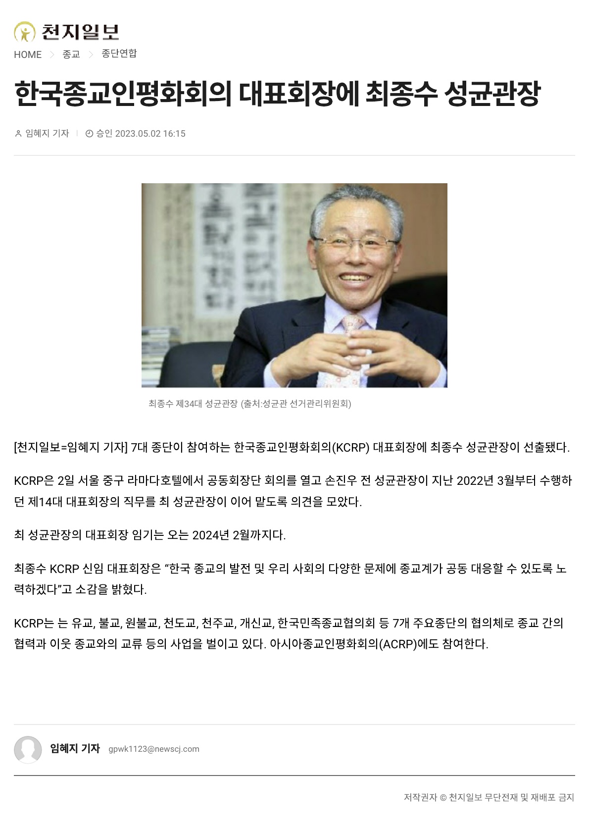 2023.05.02 õÁöÀϺ¸_Çѱ¹Á¾±³ÀÎÆòÈȸÀÇ ´ëǥȸÀå¿¡ ÃÖÁ¾¼ö ¼º±Õ°üÀå