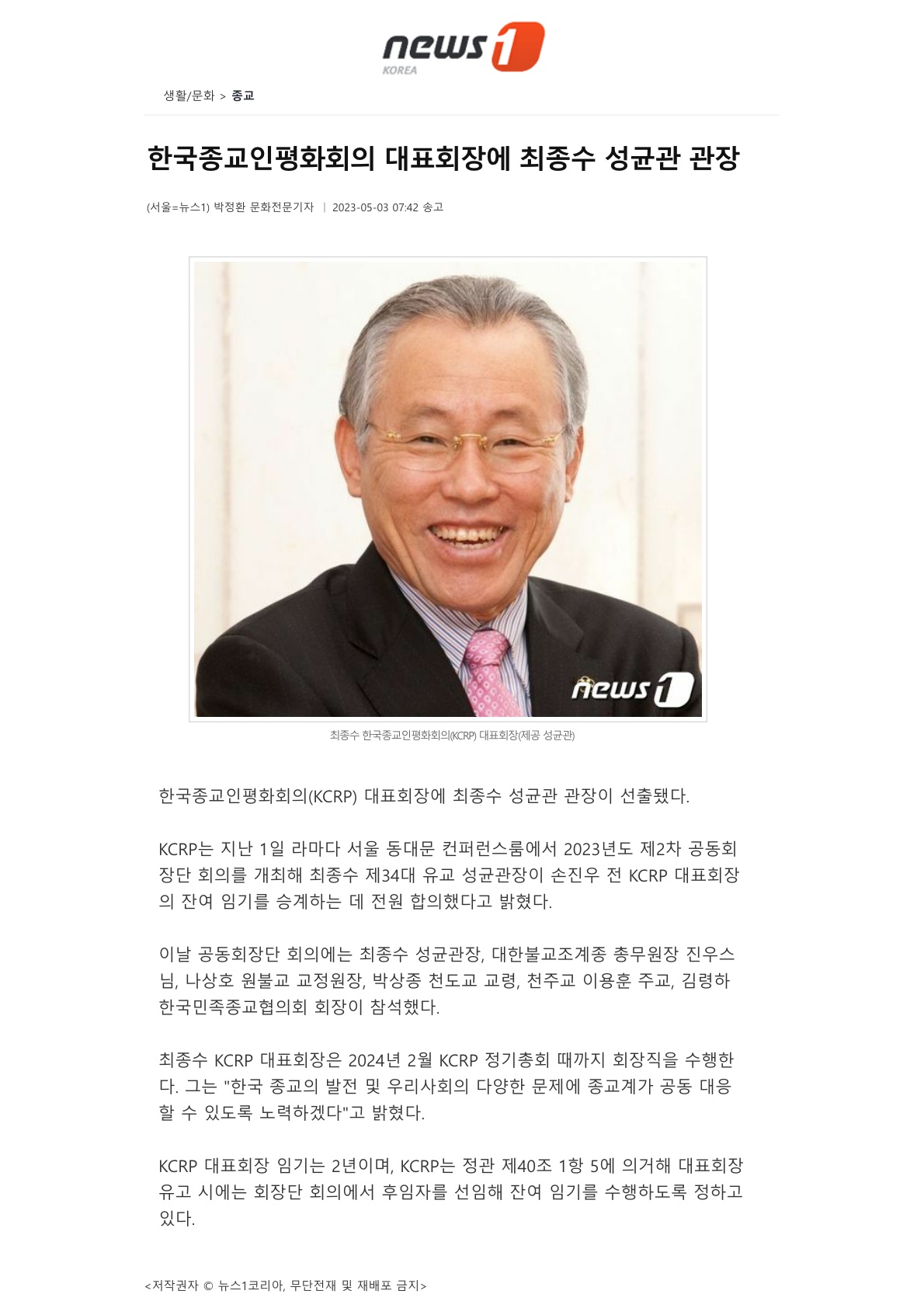 2023.05.03 ´º½º1_Çѱ¹Á¾±³ÀÎÆòÈȸÀÇ ´ëǥȸÀå¿¡ ÃÖÁ¾¼ö ¼º±Õ°ü °üÀå